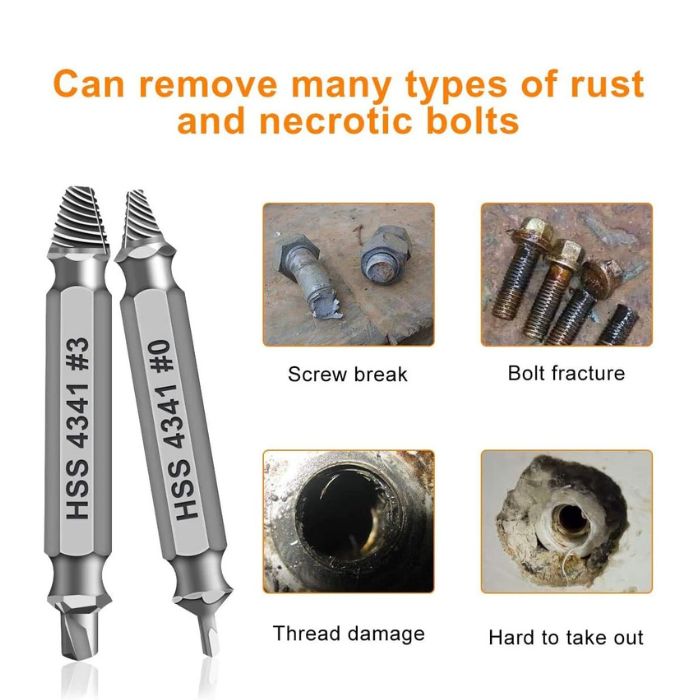 • This damaged screw remover tool kit is made from High-Speed Steel H.S.S 4341# , which have high hardness of 63hrc, it’s durable and easily to remove any damaged screws.